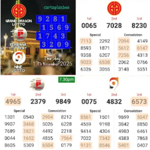 CARTAPLANBEE – Friday, 14 November 2025: 4D forecast charts for Grand Dragon Lotto, Perdana Lottery (7:30 PM), and Nine Lotto. These charts are intended solely for prediction reference.